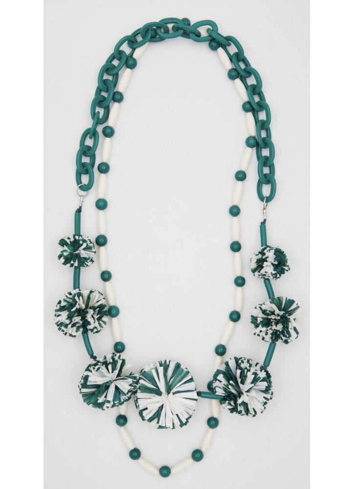 Podwójny naszyjnik wykonany z rafii z domieszką żywicy i wiskozy, z łańcuszkami, koralikami i pomponami.