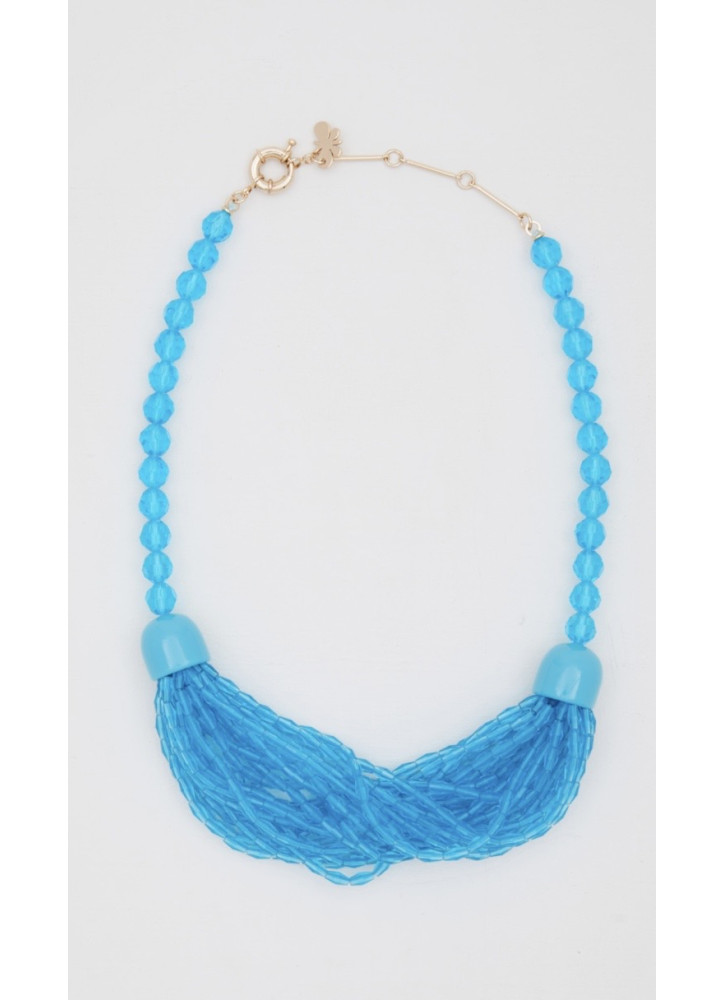 Wielorzędowy naszyjnik typu choker wykonany z żywicy z fasetowanymi koralikami i metalowymi detalami. Zapięcie na haczyk.