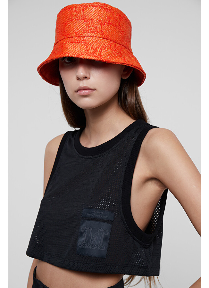 Top Max Mara z tkaniny technicznej. Model crop. Ażurowy design. Okrągły dekolt. Bez rękawów. Prosty dół. Detal z logo na przodzie.
