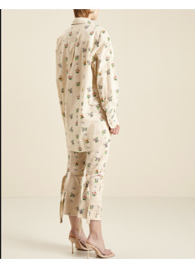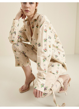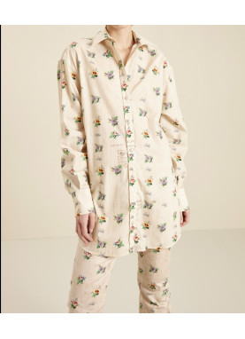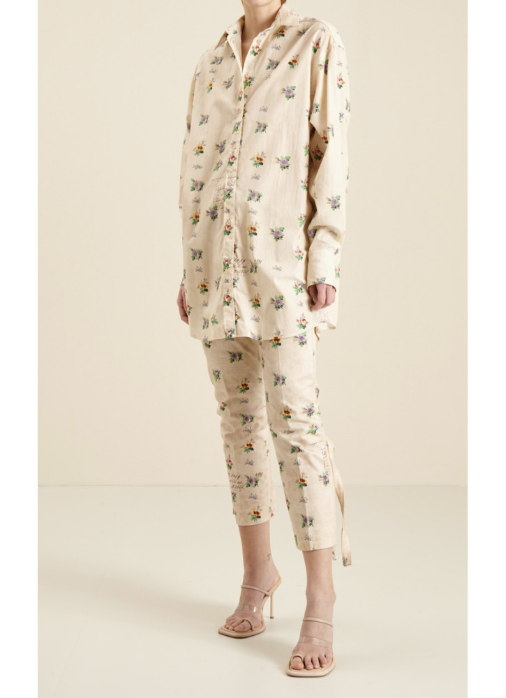 Luźna koszula z czystej bawełnianej popeliny, z obniżonymi ramionami, mankietami zapinanymi na guziki, karczkiem z kontrafałdą z tyłu, zaokrąglonym dołem i zapięciem na guziki. Kolor piaskowy.