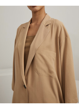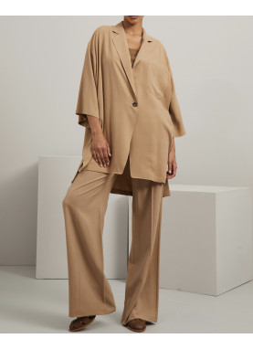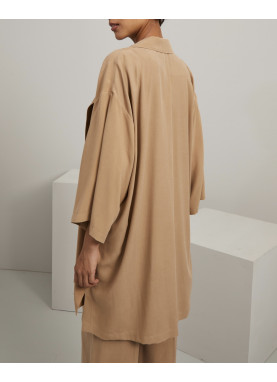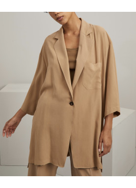 Luźna kurtka wykonana z czystego, spranego jedwabnego płótna, z kołnierzem z klapami, przedłużonymi rękawami 3/4, kieszenią na piersi i bocznymi rozcięciami. Zapinana na guziki jednorzędowe. Bez podszewki.