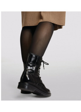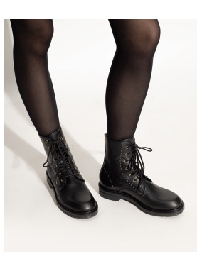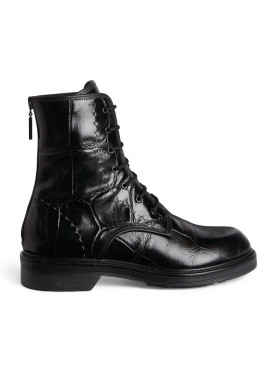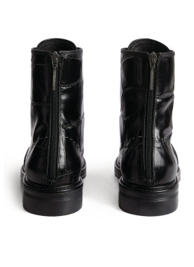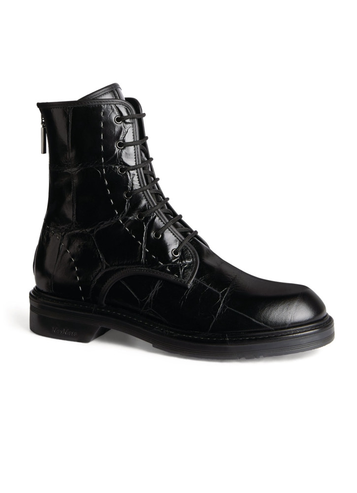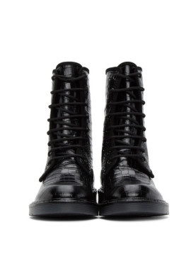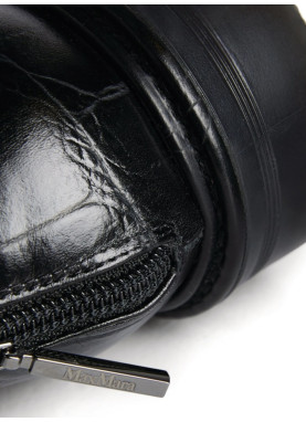 Skórzane buty za kostkę z wytłoczonym wzorem krokodyla w kolorze czarnym. Okrągły nosek. Przeplatane biłą nitką. Logo na podeszwie i na zamku z tyłu. Tonalna gumowa podeszwa. Okucia w kolorze srebrnym. Kolor dostawcy: czarny