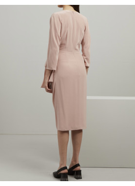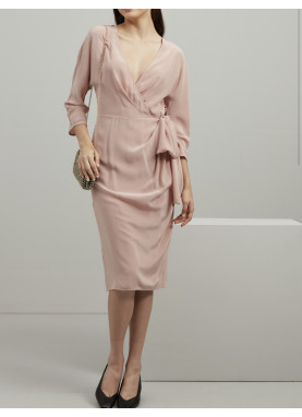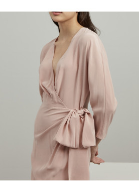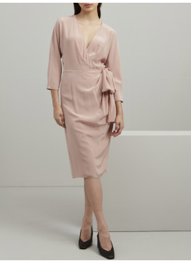 Dopasowana sukienka z czystego jedwabiu, z kopertowym dekoltem w serek, rękawami kimonowymi o długości 3/4, wiązaniem po bokach i niewidocznym zamkiem błyskawicznym z tyłu. Półpodszewka.