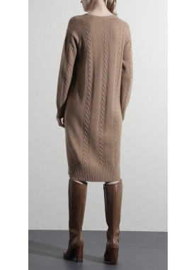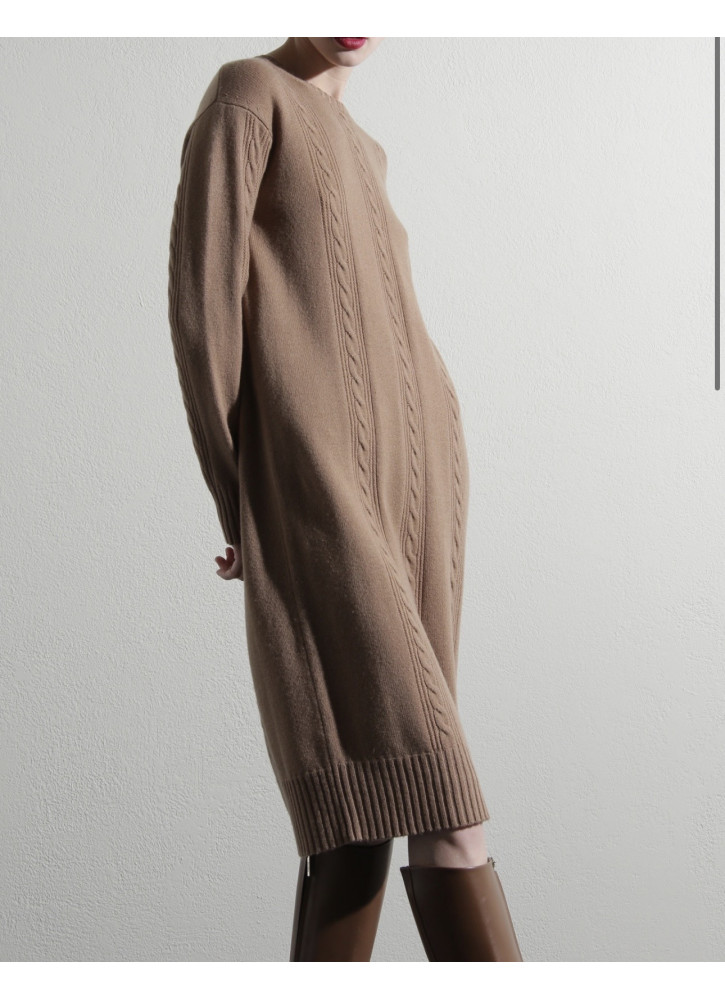 sukienka midi z dopasowanym dołem, wykonana z dzianiny wełniano-kaszmirowej z warkoczowym splotem, okrągłym dekoltem, długimi, obniżonymi rękawami i ściągaczem