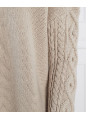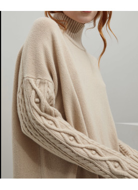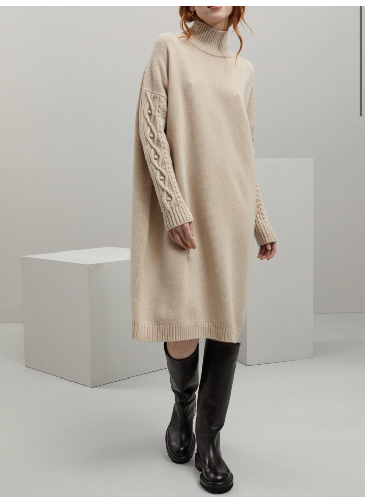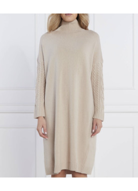 Sukienka sweterkowa  jest wykonana z gładkiej, dziewiczej wełny, z wysokim ściągaczem przy szyi i głębokimi, obniżonymi rękawami, które nadają jej luźny krój. Jest wygodna i ciepła.